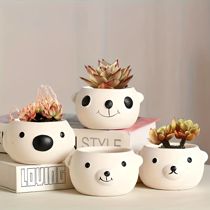 4 Cute Animal Ceramic Flowerpots with Drainage Holes - Retro Cartoon Bear Succulent Plants, Indoor And Outdoor Home Desktop Decorations, Smooth Design